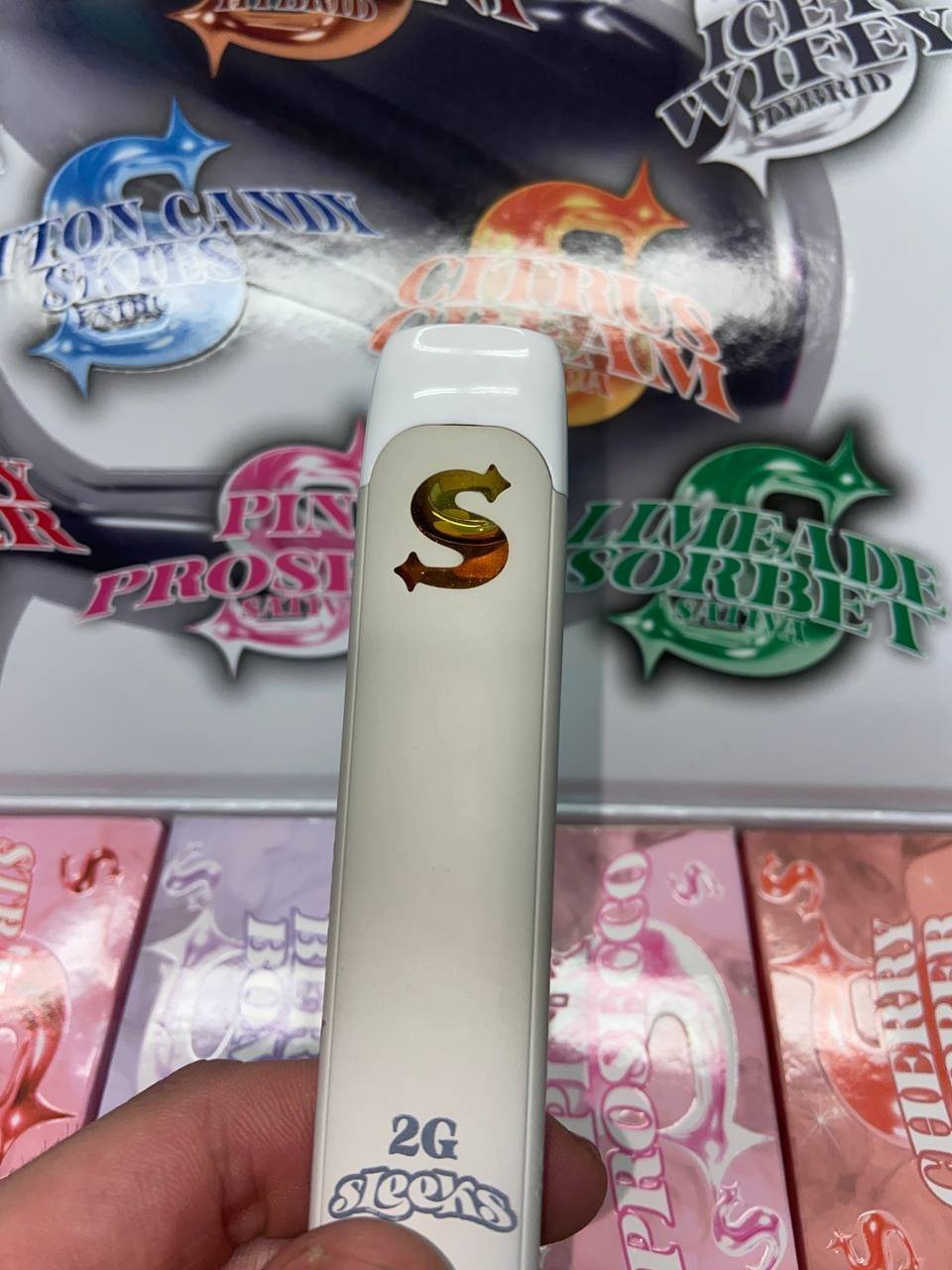 The Sleeks Disposable also comes in a variety of flavors, including Cotton Candy Skies, Berry Bomb, Strawberry Fizzy, Espresso Martini, Pineapple Malibu, Limeade Sorbet, Pink Proscco, Cherry Popper, Citrus Kream, and Icey Wifey